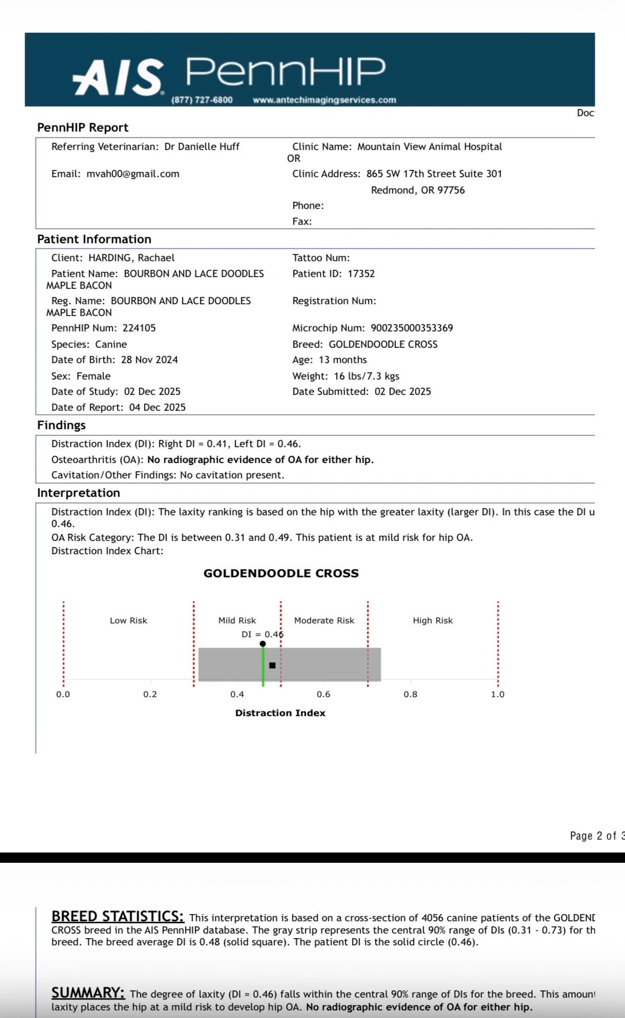 Preliminary Hip Dysplasia Evaluation Report for a female hybrid dog named Bourbon and Lace Doodle's Maple Bacon.