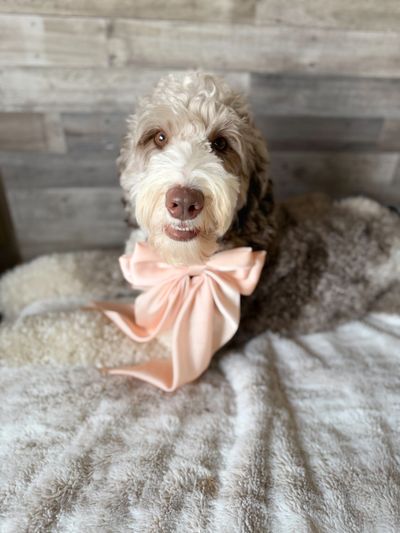 Scarlett June is a small standards multi—generational Goldendoodle weighing 45 lbs, standing at 21 inches tall. She has a beautiful chocolate Merle patterned coat with a wavy texture. She is a human focused snuggly girl who loves people and is very social. Scarlett loves to travel and is very easy to spend time with.